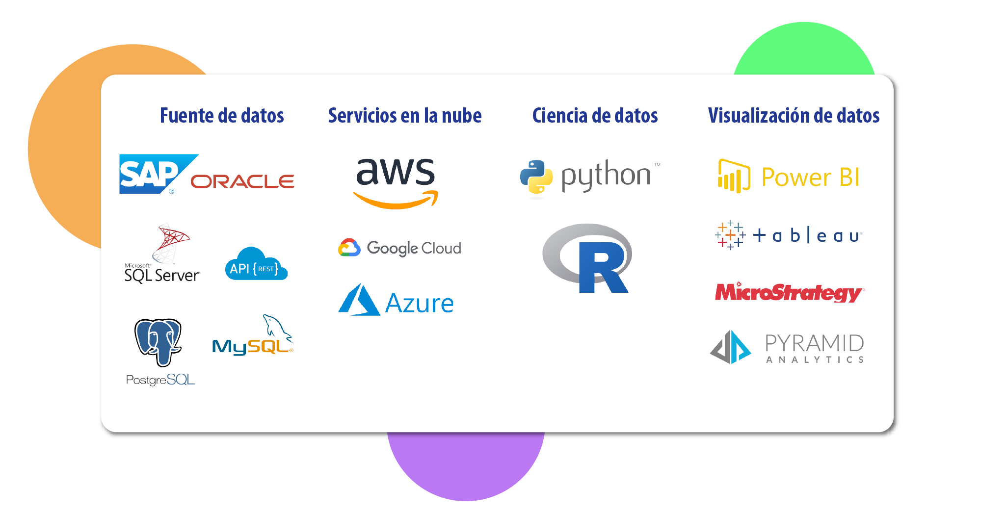 Trabajamos de la mano con gigantes de la industrias en tecnologías, especializándonos en cada una de sus herramientas para garantizar la calidad de los servicios que las empresas merecen.